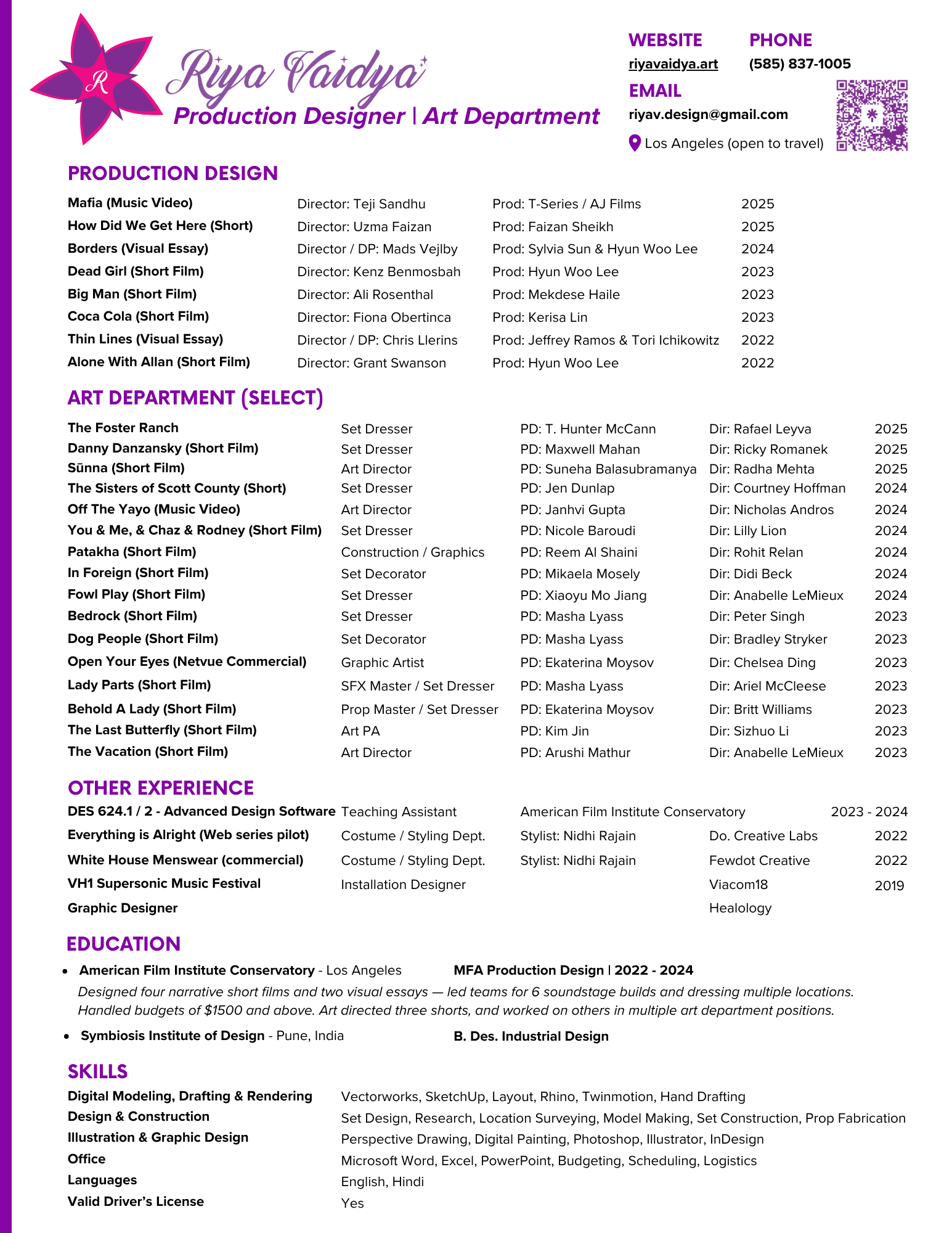 Prior to the film industry, she was a Graphic Designer for an alternative healthcare startup. She started off in the Costume & Styling department on a web series & commercial in Bangalore before moving to Los Angeles. Since then, she's been a Production Designer and Art Director on numerous productions, and worked in other Art Department positions including Set Decorator, Set Dresser, Prop Master, Set Construction, and Special Effects.